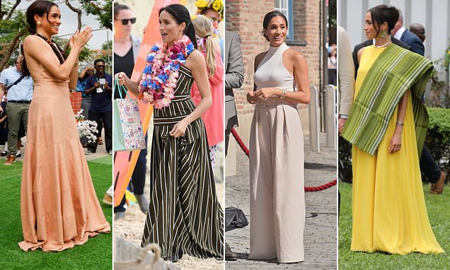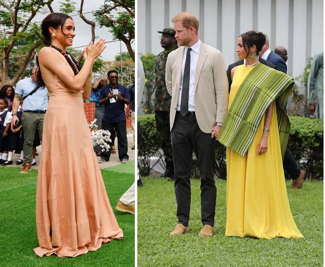 Trong chuyến thăm Nigeria cùng Vương tử Harry, cô đã mặc những bộ trang phục rất dài trong nhiều sự kiện khác nhau. Một trong những bộ đồ nổi bật là chiếc váy Windsor màu hồng nhẹ, có giá bán lẻ là £1,106 (35,6 triệu đồng) từ nhà thiết kế California, Heidi Merrick - một trong những nhà thiết kế yêu thích của Meghan. Dù có dịch vụ may đo cho khách hàng có thân hình nhỏ nhắn, Meghan dường như đã không chọn phiên bản vừa vặn mà lại chọn một chiếc váy lướt nhẹ trên sàn khi cô nhảy múa ở Abuja.