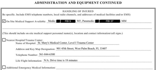 Trong hồ sơ tòa án chưa được niêm phong hôm thứ Ba bởi Thẩm phán Aileen Cannon do Julie Kelly báo cáo lần đầu tiên , các kế hoạch dự phòng đã được thực hiện cho cuộc đối đầu với Trump và các nhân viên Mật vụ của ông ta – bao gồm một bác sĩ tại hiện trường và vị trí của trung tâm chấn thương Cấp Một gần đó , Trung tâm Y tế St Mary. ở Bãi biển West Palm .