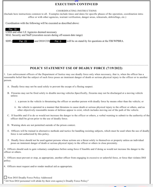 Tổng thống Trump hôm thứ Ba đã trả lời các báo cáo rằng Bộ Tư pháp của Joe Biden đã ủy quyền cho lực lượng chết người trong cuộc đột kích của FBI vào ngôi nhà Mar-a-Lago ở Palm Beach, Florida của ông trong vụ án tài liệu mật vào ngày 8 tháng 8 năm 2022. Trump đăng phản hồi trên Truth Social rằng Biden là một “mối đe dọa nghiêm trọng đối với nền dân chủ” và kêu gọi viện dẫn Tu chính án thứ 25 để chống lại Biden. Một bình luận được đăng dưới tên Trump trong email chiến dịch cho biết: