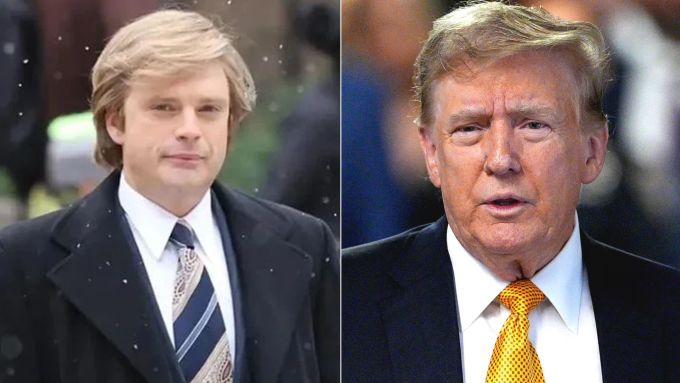 Tạo hình Trump thời trẻ trong phim (trái) và cựu tổng thống Mỹ ngoài đời. Ảnh: Backgrid/Reuters