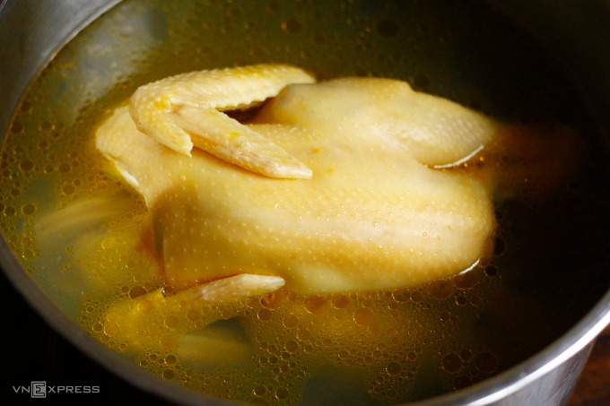 Luộc gà sủi tăm và ngâm giúp thịt mọng ngọt. Ảnh: Bùi Thủy