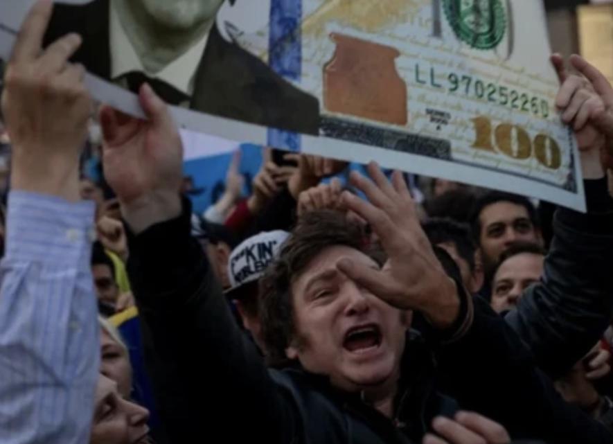 Ông Javier Milei cầm poster in mặt mình trên tờ 100 USD trong chiến dịch tranh cử tổng thống Argentina vào năm ngoái. Ảnh: Bloomberg