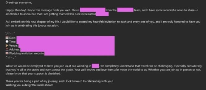 Cô gái đang làm việc ở Mỹ gửi email cho hơn 6.000 đồng nghiệp để mời dự đám cưới của cô tổ chức ở châu Á. Chủ nhân bữa tiệc chỉ gửi thư mời trước một tháng qua email. Nhiều người trong số khách mời cô chưa bao giờ gặp mặt.