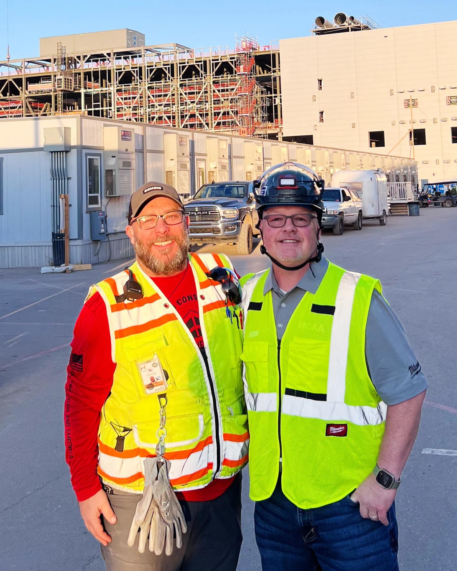 Josh Vitale và Justin Azbill đứng trước một công trường xây cất