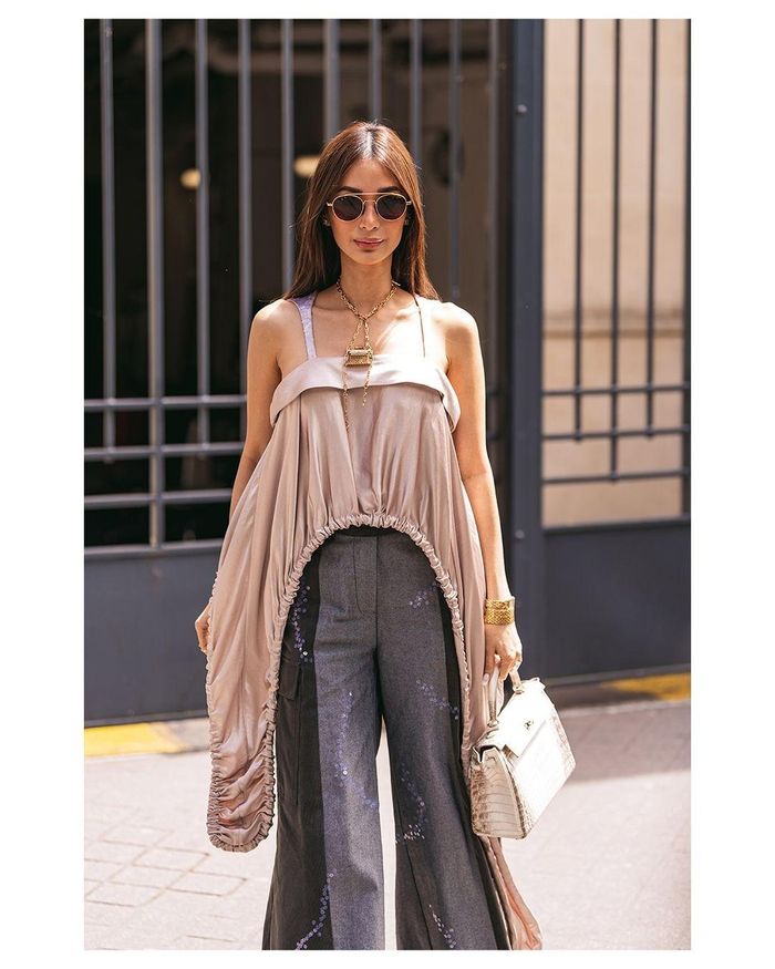 Nữ minh tinh người Philippines, Heart Evangelista, nguyên mẫu từ bộ phim Con nhà siêu giàu châu Á xuất hiện với thần thái rạng rỡ tại địa điểm diễn ra show diễn. Cô diện một chiếc áo hai dây màu beige trang nhã, phối cùng với quần denim ống rộng đang là tâm điểm xu hướng, tạo lên tổng thể vừa nền nã, lại phá cách. Ảnh: @ozgeaydinbudak_.