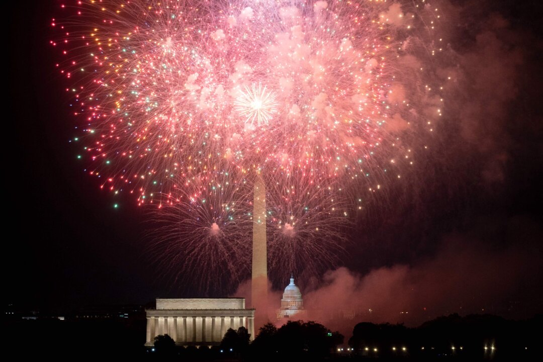 Tòa nhà Quốc hội Hoa Kỳ và Đài tưởng niệm Washington trong màn bắn pháo bông mừng Ngày Độc Lập dọc theo National Mall ở Hoa Thịnh Đốn vào ngày 04/07/2023. (Ảnh: Stefani Reynolds/AFP qua Getty Images)