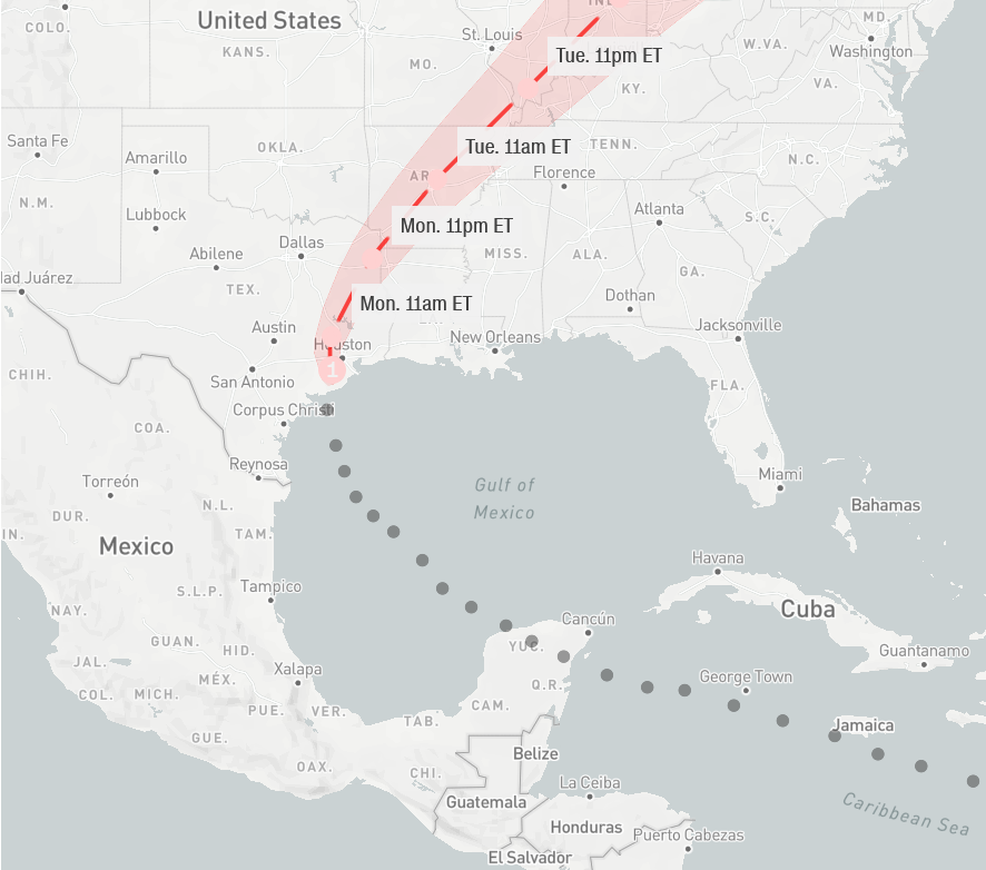 Dự báo về hướng đi của cơn bão Beryl (Hình: MapBox)