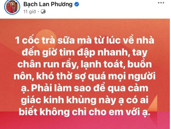 Sáng 24/7, vợ Huỳnh Anh tiết lộ gặp phải vấn đề về sức khoẻ khi uống một cốc trà sữa. "Phương đang trải qua những khoảnh khắc kinh khủng khi uống trà sữa mọi người ạ. Hiện nay là hơn 4 giờ sáng rồi. Vào tối hôm qua lúc 10 giờ, Phương có uống cốc trà sữa. Khi về đến nhà thấy xây xẩm mặt mày, chân tay bủn rủn, tim đập nhanh và cực kỳ buồn nôn.