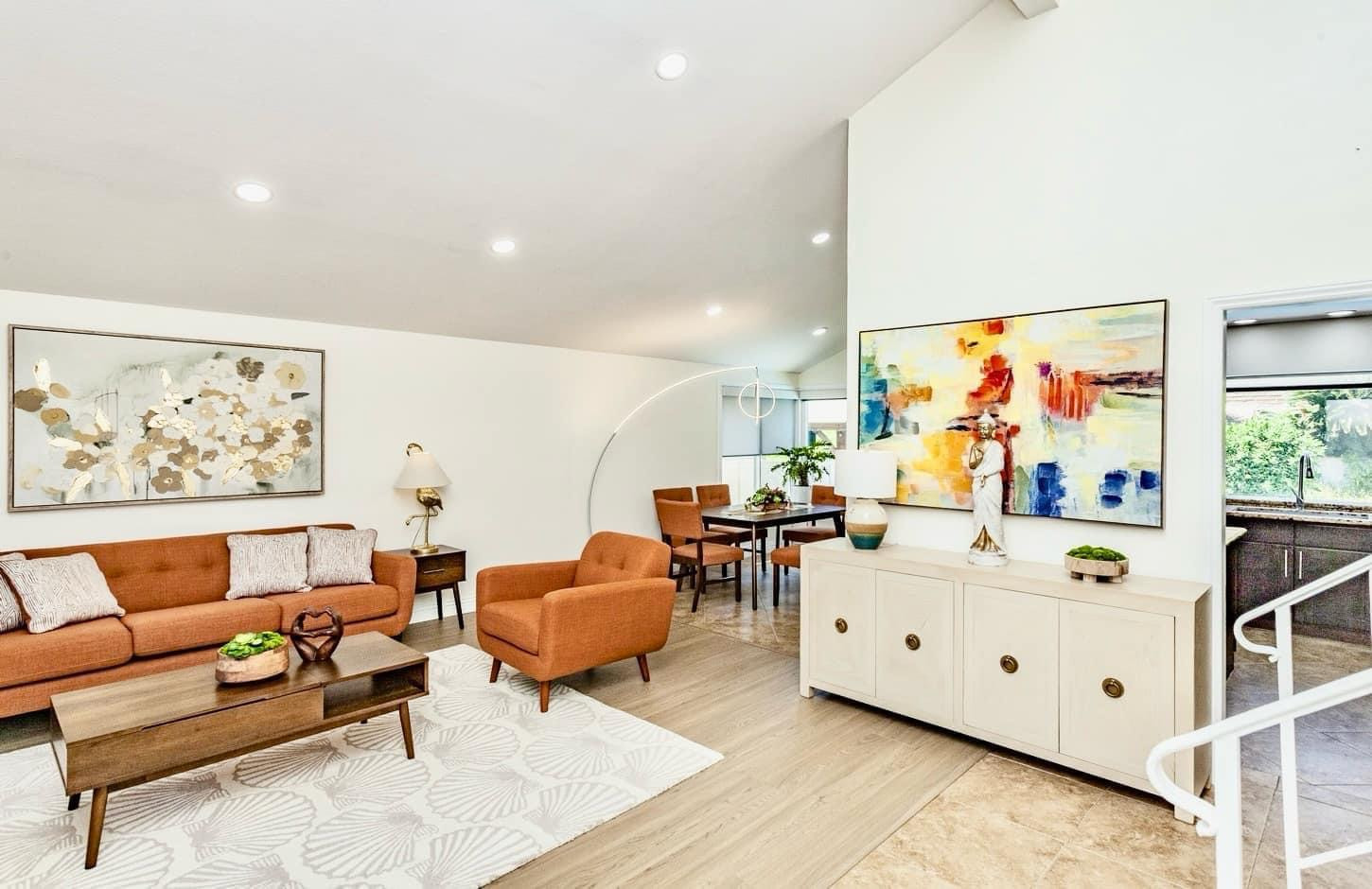 Phòng khách của ngôi nhà sử dụng tông màu cam chủ đạo, cảm giác ấm cúng, thân thiện khi bạn bè, đồng nghiệp đến thăm. Thúy Nga sơn lại tường, bày trí thêm tượng, tranh Phật và đồ đạc phù hợp với sở thích.