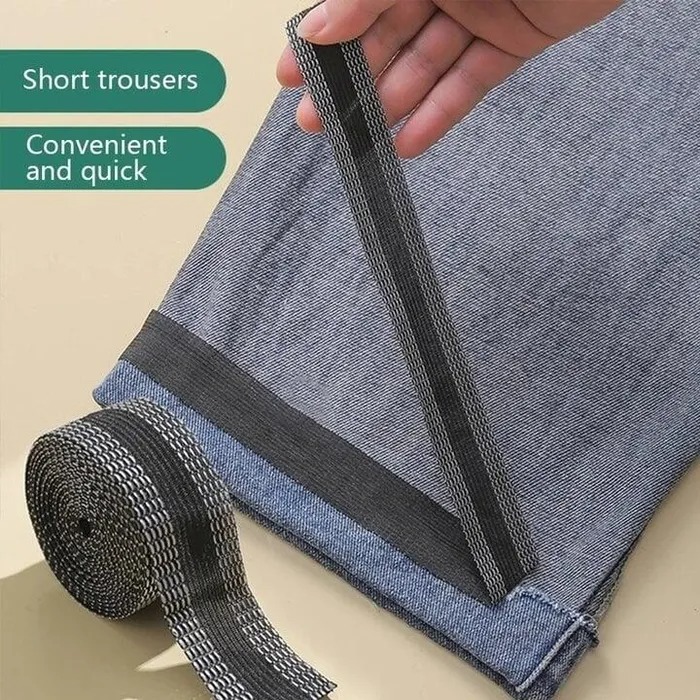 Sử dụng băng dính vải hoặc băng dính hai mặt chuyên dụng để cố định tạm thời gấu quần theo vị trí mong muốn. Sau đó, gấp nếp gấu quần cẩn thận và ủi phẳng bằng bàn ủi hơi nước. Gỡ bỏ băng dính và bạn đã hoàn tất thao tác lên gấu tạm thời.