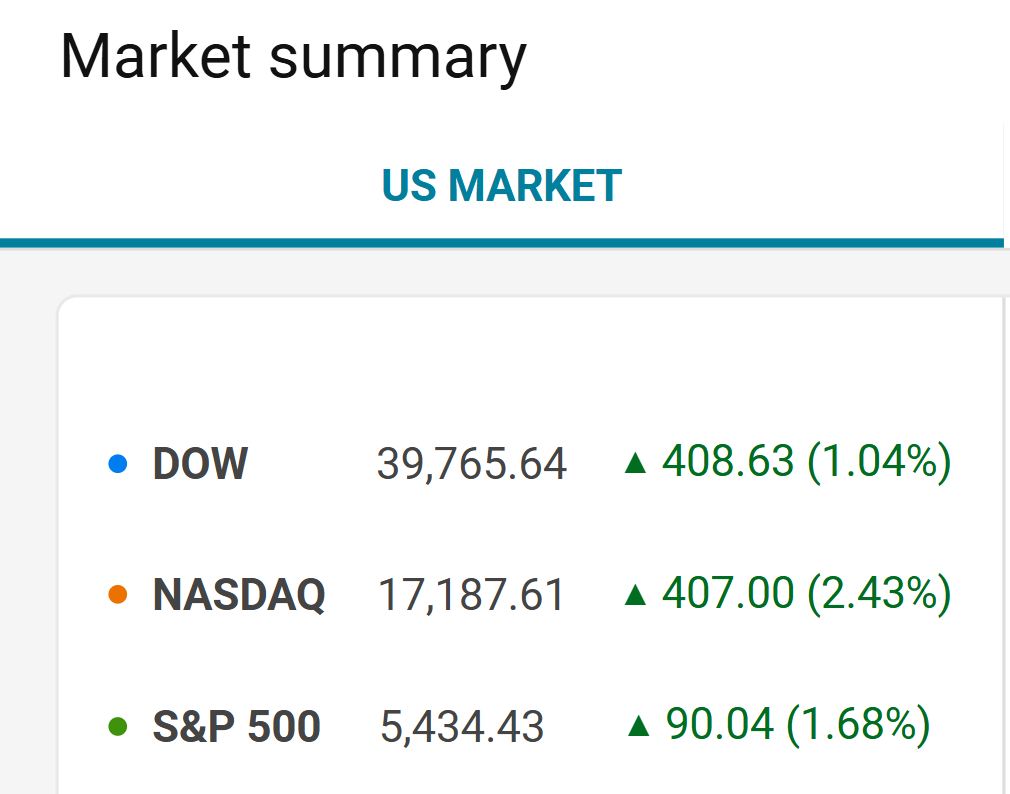 Tổng cộng, S&P 500 tăng 90,04 điểm lên 5.434,43. Dow tăng 408,63 lên 39.765,64 và Nasdaq composite tăng 407,00 lên 17.187,61.