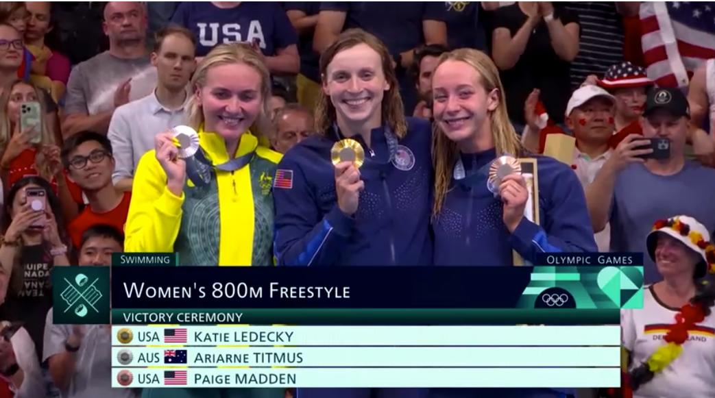 Katie Ledecky một lần nữa khẳng định vì sao cô được đánh giá là một trong những lực sĩ bơi lội vĩ đại nhất mọi thời đại sau khi giành chiến thắng trong nội dung bơi tự do 800 mét vào thứ Bảy (3 tháng 8). Theo Reuters, trước đó, Ledecky đã giành chiến thắng áp đảo ở nội dung 1500m. Tuy nhiên, nội dung bơi tự do 800m lại gây cấn từ đầu đến cuối, với đối thủ Ariarne Titmus theo sau cô suýt soát trên toàn chặng đua. Nhưng Ledecky đã không để đối thủ vượt lên dẫn trước, và Titmus phải chấp nhận huy chương bạc khi Ledecky chạm đích đầu tiên với thời gian 8 phút 11.04 giây. Paige Madden giành huy chương đồng cho Hoa Kỳ. Trong khi đó, một nữ lực sĩ tỏa sáng khác là Summer McIntosh, khi cô trở thành lực sĩ Canada đầu tiên giành ba huy chương vàng tại một kỳ Olympic. McIntosh, chỉ mới 17 tuổi, đã lập kỷ lục Olympic trong nội dung 200m đơn với thời gian là 2:06.56, phá kỷ lục năm 2016 là 2:06.58 do Katinka Hosszu của Hungary lập. Kate Douglass của Hoa Kỳ đã giành huy chương bạc và Kaylee McKeown của Úc đã được trao huy chương đồng. McIntosh hiện đã có bốn huy chương tại Paris sau khi giành chiến thắng ở nội dung bơi bướm 200m vào thứ Năm và giành huy chương bạc ở nội dung bơi tự do 400m vào ngày khai mạc thứ Bảy trước đó.