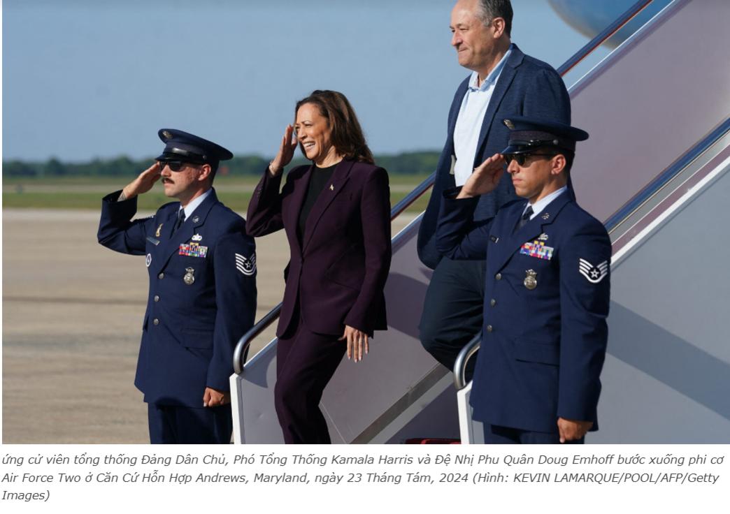 ứng cử viên tổng thống Đảng Dân Chủ, Phó Tổng Thống Kamala Harris và Đệ Nhị Phu Quân Doug Emhoff bước xuống phi cơ Air Force Two ở Căn Cứ Hỗn Hợp Andrews, Maryland, ngày 23 Tháng Tám, 2024 (Hình: KEVIN LAMARQUE/POOL/AFP/Getty Images)