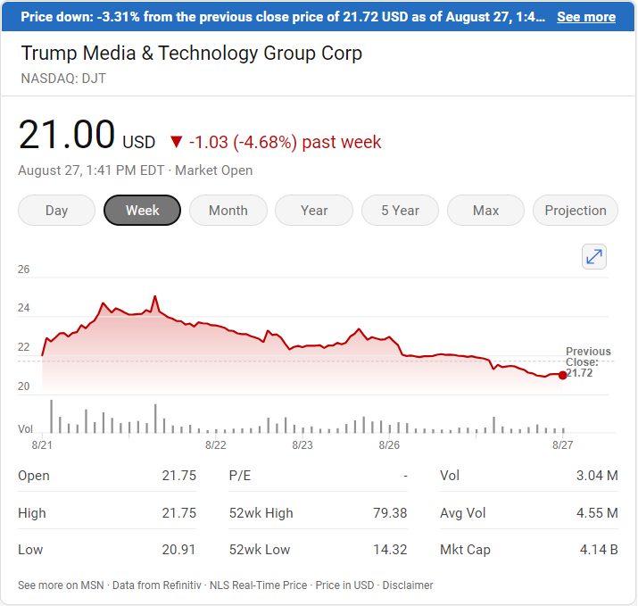 Trump Media & Technology Group, công ty sở hữu Truth Social, đã tăng vọt lên mức định giá cao nhất mọi thời đại là gần 8 tỷ đô la khi sáp nhập với một công ty mua lại séc trắng vào tháng 3. Với cổ phiếu lao dốc, mức định giá đó đã giảm gần một nửa kể từ đó.
