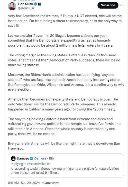 "Rất ít người Mỹ nhận ra rằng, nếu Trump KHÔNG ĐẮC CỬ, thì đây sẽ là cuộc bầu cử cuối cùng. Ông ấy không phải là mối đe dọa đối với nền dân chủ, mà là cách duy nhất để cứu nền dân chủ! Hãy để tôi giải thích: nếu thậm chí 1 trong 20 người nhập cư bất hợp pháp trở thành công dân mỗi năm, điều mà đảng Dân chủ đang đẩy nhanh nhất có thể, thì sẽ có khoảng 2 triệu cử tri hợp pháp mới trong 4 năm. Biên độ bỏ phiếu ở các tiểu bang dao động thường ít hơn 20 nghìn phiếu bầu. Điều đó có nghĩa là nếu Đảng "Dân chủ" thành công, sẽ không còn tiểu bang dao động nào nữa!! Hơn nữa, chính quyền Biden/Harris đã đưa những "người xin tị nạn", những người được cấp quyền công dân nhanh chóng, trực tiếp đến các tiểu bang dao động như Pennsylvania, Ohio, Wisconsin và Arizona. Đây là cách chắc chắn để giành chiến thắng trong mọi cuộc bầu cử. Khi đó, nước Mỹ sẽ trở thành một quốc gia độc đảng và nền Dân chủ đã kết thúc. "Cuộc bầu cử" duy nhất sẽ là cuộc bầu cử sơ bộ của Đảng Dân chủ. Điều này đã xảy ra ở California nhiều năm trước, sau lệnh ân xá năm 1986. Điều duy nhất ngăn cản California khỏi chủ nghĩa xã hội cực đoan và các chính sách ngột ngạt của chính phủ là mọi người có thể rời khỏi California và vẫn ở lại Hoa Kỳ. Một khi hoàn toàn đất nước bị một đảng kiểm soát, sẽ không có lối thoát. Mọi nơi ở Hoa Kỳ sẽ giống như cơn ác mộng ở trung tâm thành phố San Francisco."