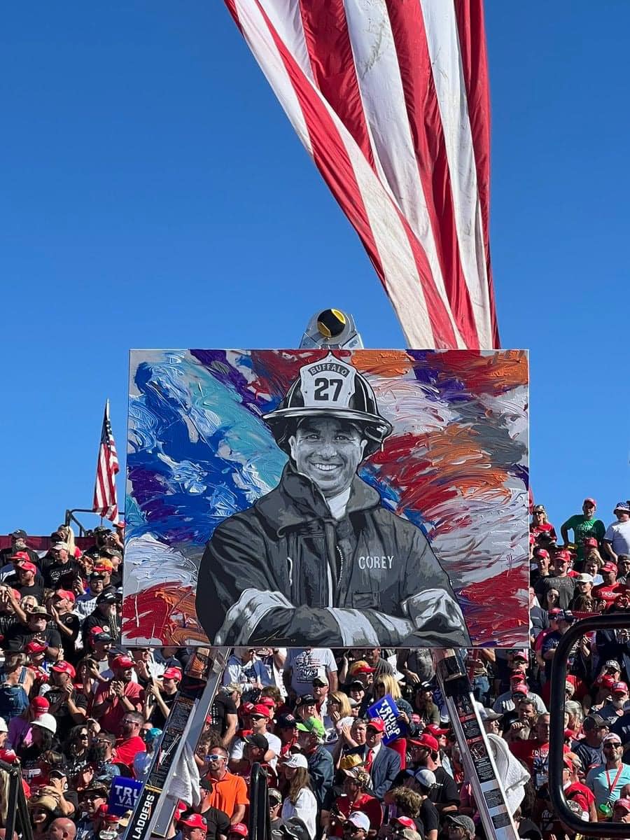 Tấm hình người lính cứu hỏa, người đã thiệt mạng trong vụ ám sát ôngTrump13/7 được trân trọng xuất hiện trong buổi mít tinh này.