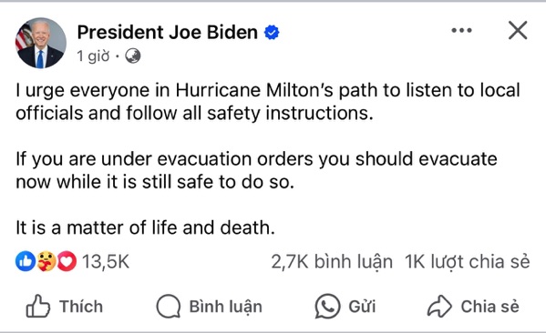 Cách đây khoảng 1 tiếng ông Biden cảnh báo trên mạng xă hội Tôi kêu gọi mọi người trên đường đi của Băo Milton hăy lắng nghe các viên chức địa phương và tuân thủ mọi hướng dẫn an toàn.