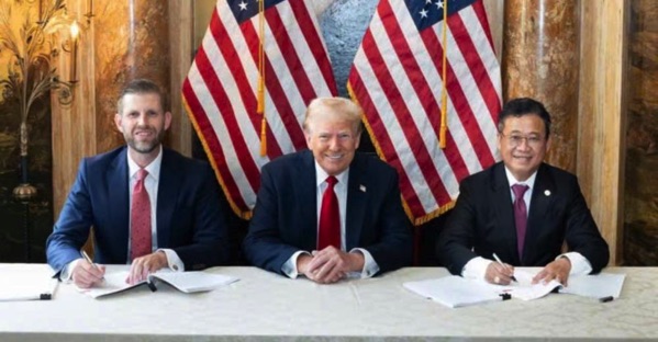 Ông Eric Frederick Trump (trái) và ông Đặng Thành Tâm (phải), Chủ tịch KBC, tại lễ kư kết hợp tác giữa Trump Organization và Tập đoàn Đầu tư Hưng Yên, dưới sự chứng kiến của cựu Tổng thống Donald Trump (giữa), tại New York, Mỹ, vào ngày 25/9/2024.