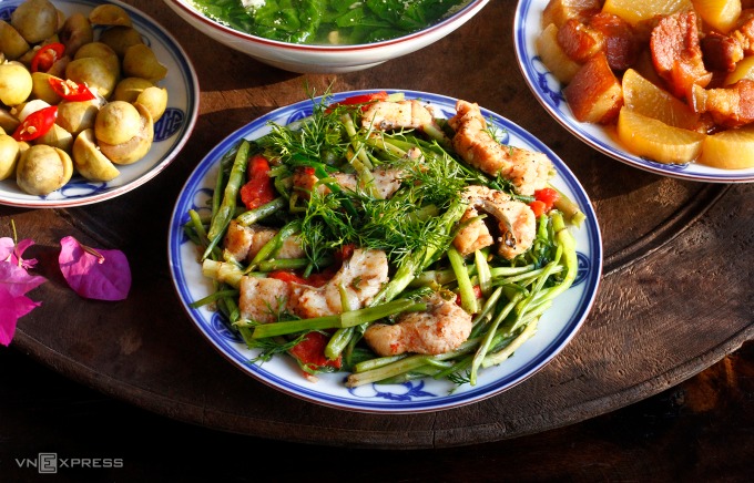 Cá quả xào rau cần là món ăn cổ của Hà Nội, tùy theo mùa mà thay đổi đồ độn xào kèm như rau cần ta hoặc rau cải, su hào thái mỏng... đều ngon.