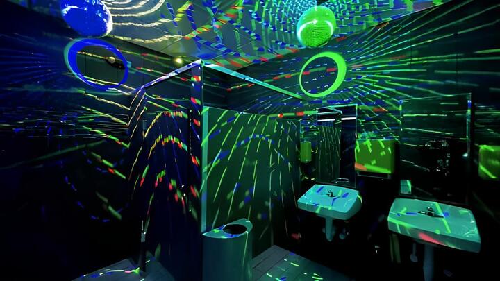 Nhà vệ sinh chiết trung của MAD ở thành Houston, Texas, thiết kế theo phong cách Tây Ban Nha kết hợp với chủ đề vũ trụ, tôn vinh họa tiết Thành phố vũ trụ của Houston. Hành lang phòng vệ sinh được phủ bằng gương và đèn neon phản chiếu những sắc thái rực rỡ tạo ra ảo giác về không gian vô tận. (Ảnh: Cintas)