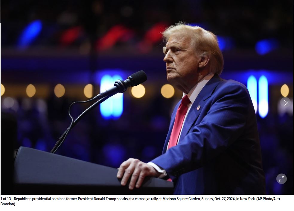 NEW YORK (AP) — Donald Trump đã lên sân khấu vào tối Chủ Nhật tại Madison Square Garden ở New York để đưa ra bài phát biểu kết thúc chiến dịch tranh cử của mình khi cuộc bầu cử chỉ còn chín ngày nữa là diễn ra sau khi một số đồng minh của ông sử dụng những lời lăng mạ thô lỗ và phân biệt chủng tộc đối với Phó Tổng thống Kamala Harris và những người chỉ trích cựu tổng thống khác.