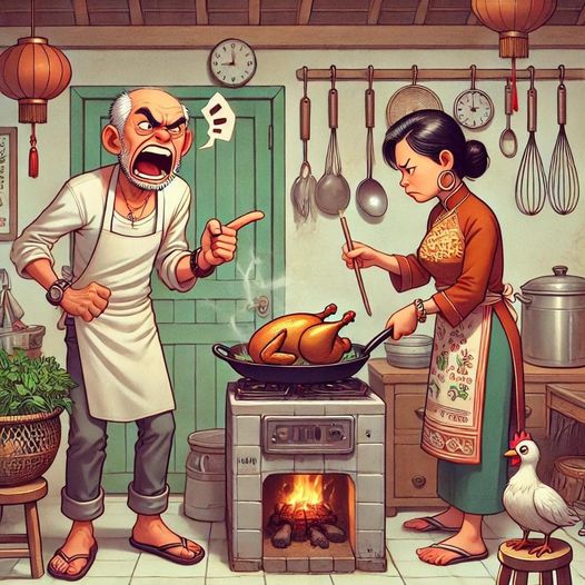 Bà quay phắt lại và quát: "Trời đất ơi! Tôi đã trả lời cả trăm lần là CƠM GÀ mà sao ông vẫn hỏi?"