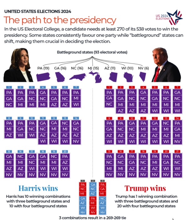 Các tiểu bang chiến trường và 20 trường hợp thắng dành cho ông Trump cũng như bà Harris, 3 khả năng hoà 269-269.