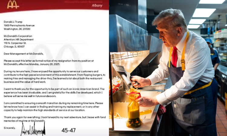 "Xin hãy chấp nhận thư này như thông báo chính thức về việc tôi từ chức khỏi vị trí của mình tại McDonald's, từ ngày 20/1/2025", Donald Trump Jr. hôm nay đăng trên mạng xã hội hình ảnh bức thư có chèn tên, chữ ký của Donald Trump gửi phòng nhân sự McDonald's.