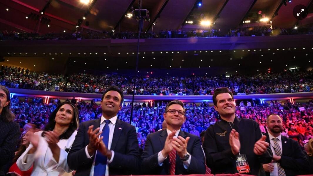Một số nhân vật trong ảnh được ông Trump đề cử giữ vị trí trong nội các: Bà Tulsi Gabbard, ông Vivek Ramaswamy (thứ nhất và thứ hai từ trái sang), và ông Matt Gaetz (thứ tư từ trái sang) tại một cuộc mít tinh của ông Donald Trump ở thành phố New York vào hồi tháng 10. Ảnh: New York Times.