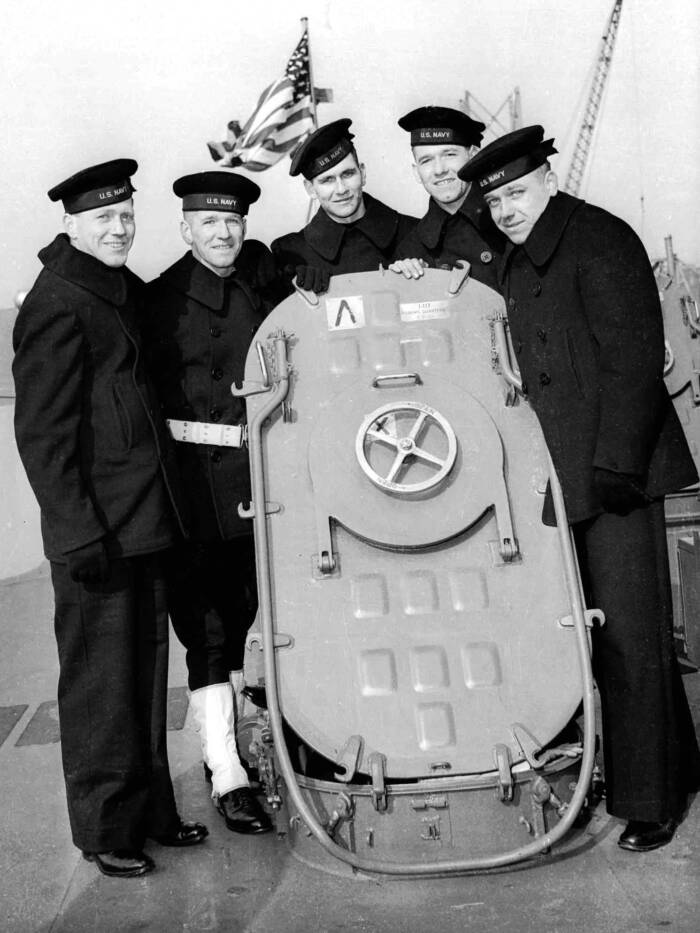 Ảnh năm anh em nhà Sullivan - Joe, Frank, Al, Matt và George - tại buổi vận hành tàu USS Juneau