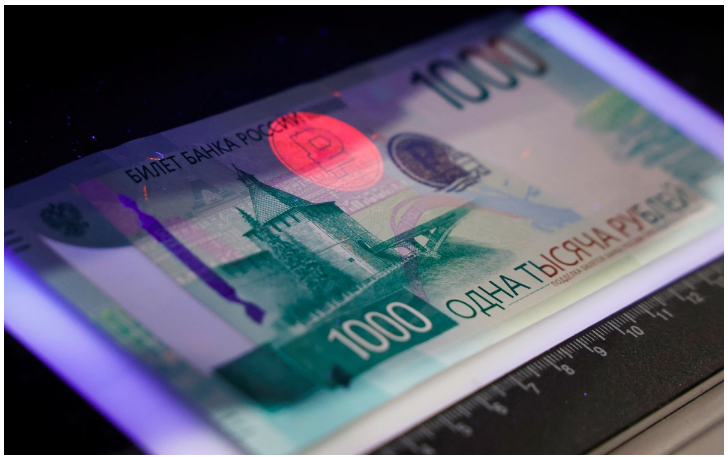 Đồng rúp Nga trong máy soi chiếu tiền tệ. Ảnh: Reuters.