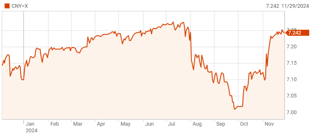 Các nhà kinh tế học tại JPMorgan cho rằng lo ngại gây bất ổn tài chính sẽ khiến giới chức Trung Quốc lần này không hành động quá mạnh tay. Từ khi ông Trump tái đắc cử, nhân dân tệ trên thị trường Trung Quốc đã giảm 1,4% so với USD. Hiện tại, tỷ giá là 7,24 CNY một USD.