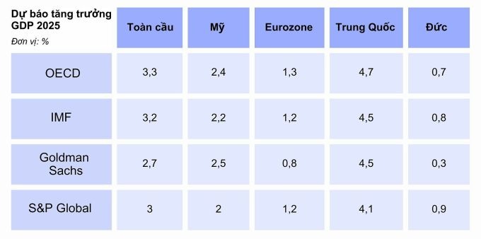 Dự báo tăng trưởng GDP toàn cầu 2025, OECD lạc quan hàng đầu với mức 3,3%, tiếp đến là IMF với 3,2%. Thận trọng hơn, Morgan Stanley và Goldman Sachs đưa ra dự báo lần lượt là 3% và 2,7%. Triển vọng khác nhau đáng kể giữa các khu vực.