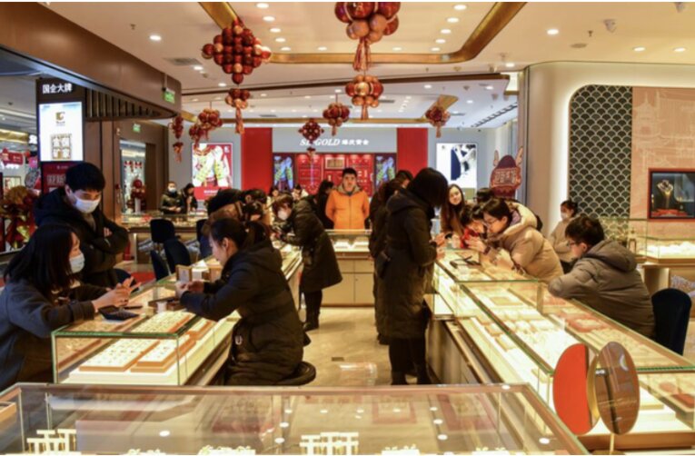 Khách hàng chọn trang sức vàng tại một tiệm vàng ở Tế Nam, tỉnh Sơn Đông - Trung Quốc. Ảnh TÂN HOA XÃ