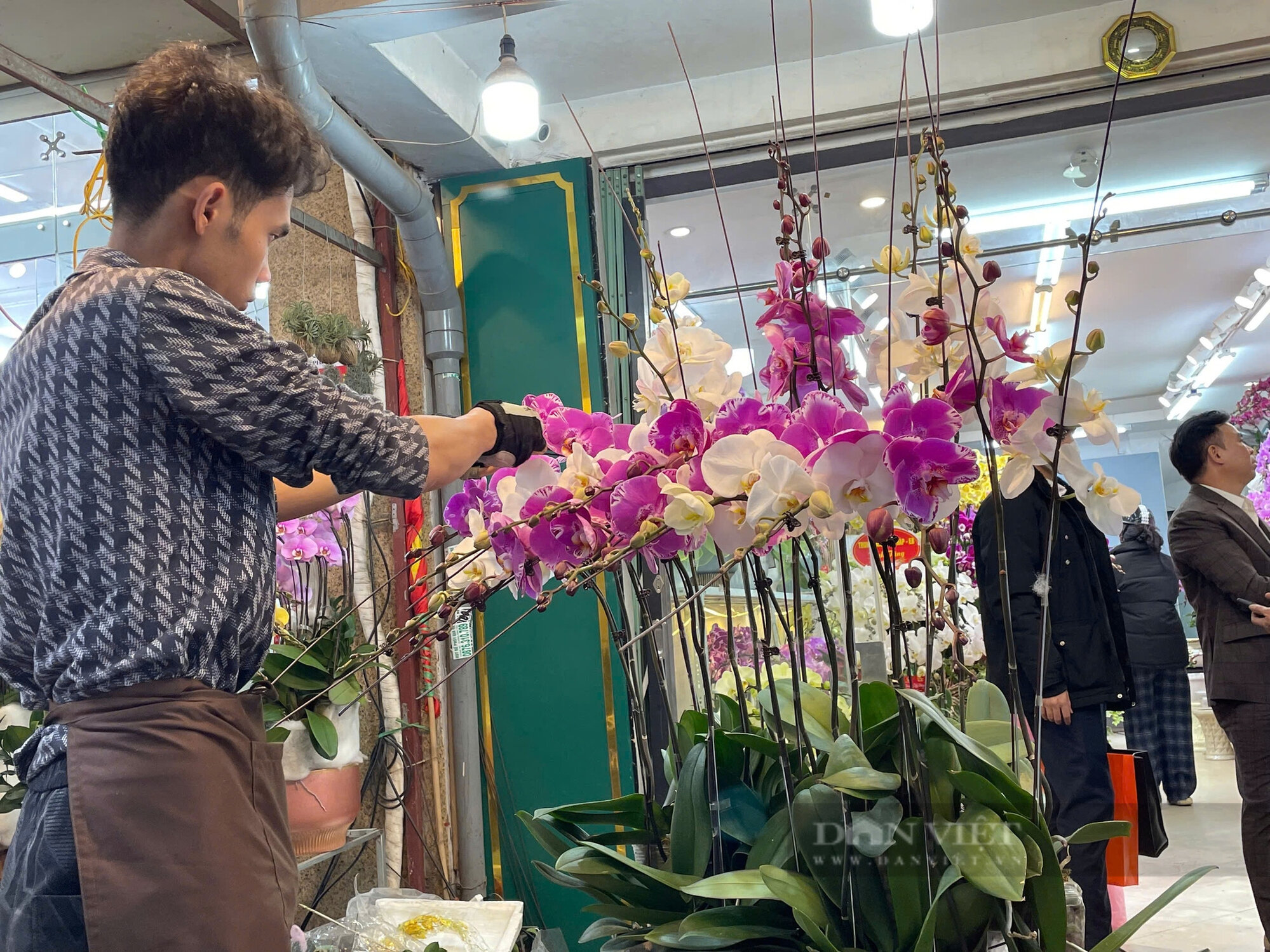 Trước thềm Tết Nguyên Đán, tại một cơ sở kinh doanh hoa khu Nghĩa Tân, Cầu Giấy, Hà Nội, anh Việt Hoàng đang bận rộn cắm hoa lan. Với hơn 10 năm kinh nghiệm, anh có thể cắm từ 300 đến 500 cành hoa mỗi ngày.
