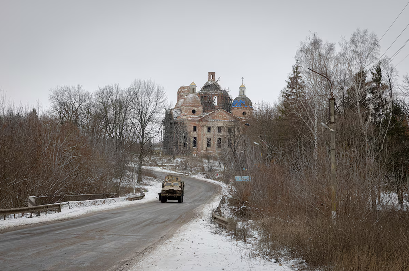 Một chiếc xe quân sự Ukraine tiến về biên giới Nga vào ngày 8/12/2024, đi qua một nhà thờ bị phá hủy ở làng Yunakivka của Ukraine, thuộc vùng Sumy. Ảnh: Washington Post.