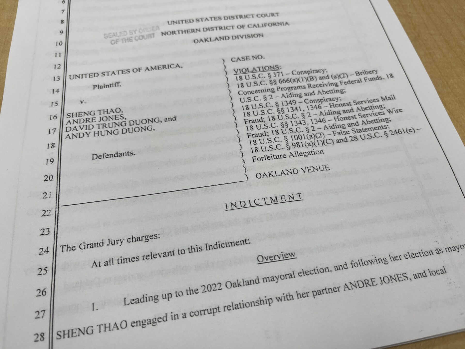 Theo hồ sơ truy tố dài 22 trang, đề ngày 9 Tháng Giêng, trước và sau cuộc bầu cử thị trưởng năm 2022, bà Sheng Thao và ông Andre Jones có dính tham nhũng liên quan đến ông David Dương và ông Andy Dương.