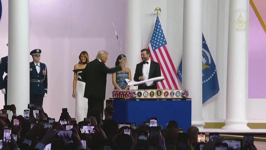 Tổng thống Mỹ thứ 47 Donald Trump và Phó tổng thống JD Vance cùng hai phu nhân đứng trên sân khấu vũ hội Tổng tư lệnh ngày 20/1 để cắt một chiếc bánh được làm theo hình chuyên cơ Không lực một cùng phần đường băng gắn biểu tượng của các quân chủng Mỹ.