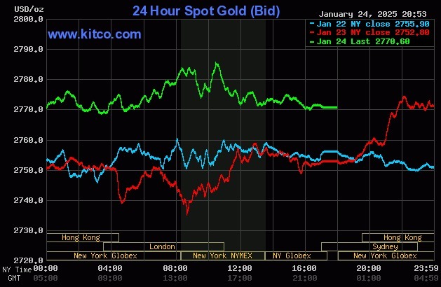 Chốt phiên giao dịch 24/1, giá vàng thế giới giao ngay tăng 17 USD lên 2.770 USD. Trong phiên, giá có thời điểm chạm 2.786 USD một ounce - tiến sát đỉnh lịch sử 2.790 USD xác lập phiên 31/10/2024.