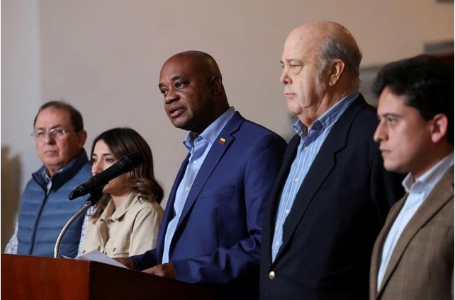 Ngoại trưởng Colombia Luis Gilberto Murillo (giữa) phát biểu tại cuộc họp báo tại Bộ Ngoại giao Colombia ở Bogota về quyết định tiếp nhận công dân đến Mỹ bất hợp pháp