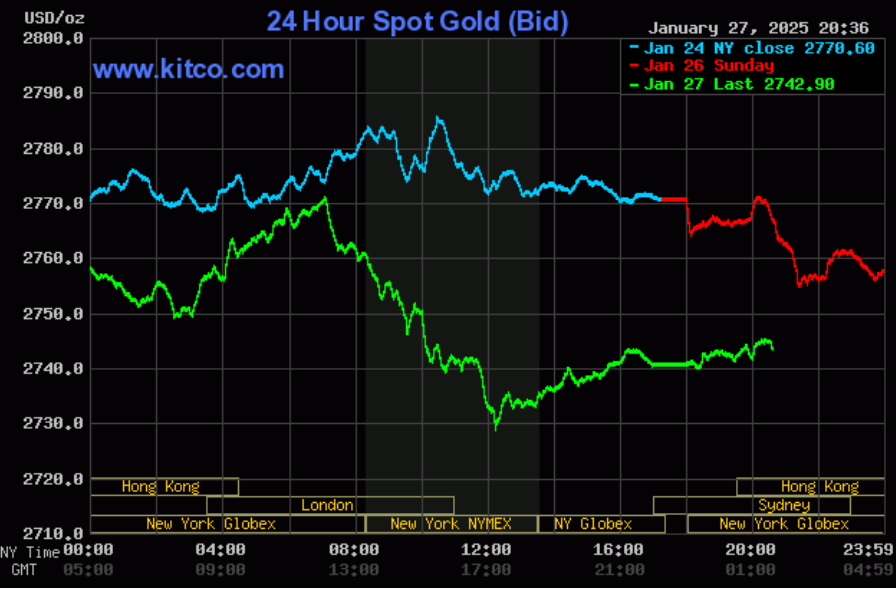 Chốt phiên giao dịch 27/1, giá vàng thế giới giao ngay giảm hơn 30 USD xuống 2.740 USD một ounce. Trong phiên, giá có thời điểm xuống dưới 2.730 USD.