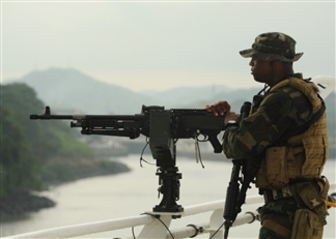 Hạ sĩ quan hạng 3 Jerris Bradley đứng canh gác trên tàu bệnh viện USNS Comfort. (Ảnh do Bộ Quốc pḥng Hoa Kỳ cung cấp.)