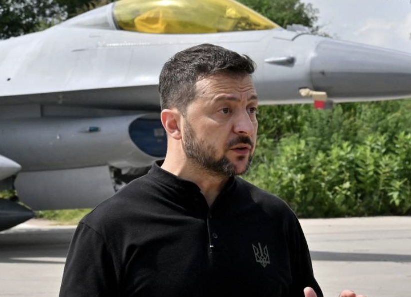 Tổng thống Ukraine Volodymyr Zelensky phát biểu với truyền thông khi đứng trước một máy bay chiến đấu F-16 tại một địa điểm không được tiết lộ vào ngày 4 tháng 8 năm 2024. Ảnh Getty Images