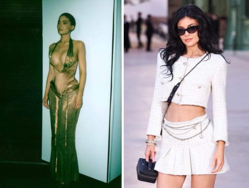 Chiếc váy hở bạo của Kylie Jenner (ảnh trái). Trước đó, cô dự show Chanel (ảnh phải). Ảnh: @kyliejenner, WireImage.