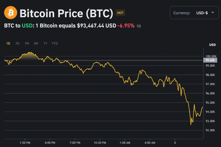 Theo dữ liệu từ CoinMarketCap, giá bitcoin tiếp tục giảm mạnh trong ngày 3/2, có thời điểm mất mốc 93.000 USD/BTC. Hiện bitcoin được giao dịch quanh mốc 94.000 USD, mức thấp nhất trong ṿng 2 tuần qua.