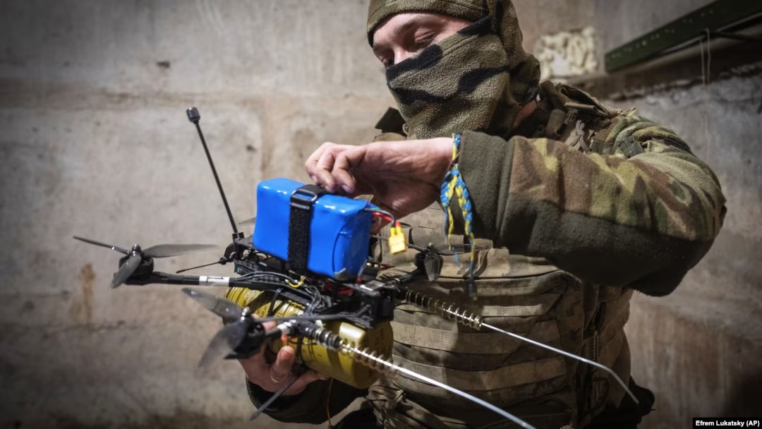 Một người lính Ukraine thuộc Lữ đoàn Jaeger số 71 đang chuẩn bị máy bay không người lái ở tiền tuyến gần Avdyivka, vùng Donetsk. Ảnh Rferl