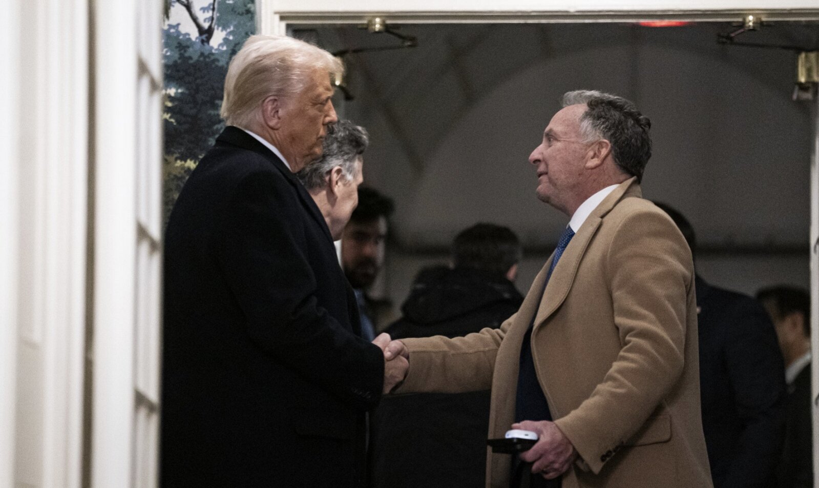 Tổng thống Mỹ Donald Trump bắt tay ông Steve Witkoff, đặc phái viên Mỹ về Trung Đông, khi ông ra chào đón ông Marc Fogel trở về Mỹ sau khi được trả lại tự do khỏi sự giam giữ của phía Liên bang Nga, ngày 11/2/2025 tại Washington, D.C. (Ảnh: Getty Images)