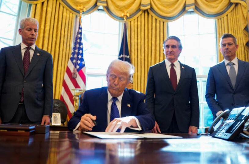 Tổng thống Trump ký sắc lệnh hành pháp bên cạnh Bộ trưởng Giao thông Sean Duffy và Bộ trưởng Nội vụ Doug Burgum tại Phòng Bầu dục ngày 14-2 - Ảnh: REUTERS