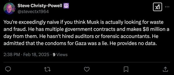 In February 2025, claims circulated on Facebook (archived) and X (archived) that billionaire tech entrepreneur Elon Musk, who was hired by the Trump administration to root out government waste and fraud, was himself making $8 million per day from federal contracts.