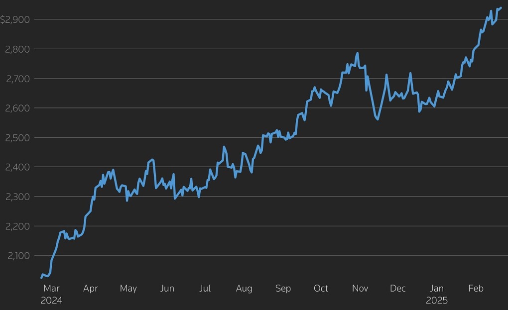 Giá kim loại quý xác lập kỷ lục mới tại 2.955 USD một ounce, do nhu cầu trú ẩn tiếp tục tăng cao.